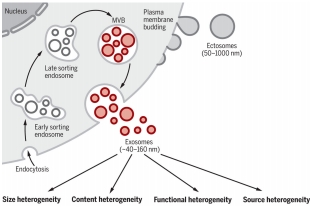 外泌体的研究始于 30 年前,最初被认为是一种细胞性的废弃物,可以将细胞不需要的蛋白和分子物质运输到细胞外。早在1983 年,通过对非溶酶体的多泡内含体 ( multivesicular endosomes) 研究,Harding等发现,其由于内吞作用富集了大量的标志性转运蛋白,随后与质膜融合并且通过胞吐作用释放出内含的囊泡结构。四年后,Johnstone和他的团队首次用外泌体 ( exosomes) 这一名词来命名多泡体释放出的囊泡状结构。
